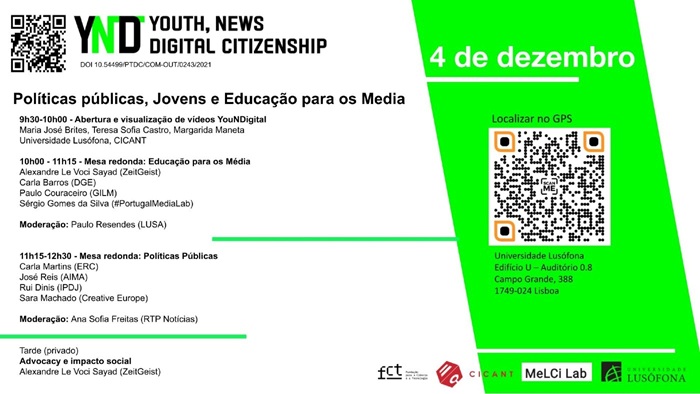 4 de dezembro 2025 | Universidade Lusófona, Lisboa O evento “Políticas Públicas, Jovens e Educação para os Media”, a realizar-se no dia 4 de dezembro na Universidade Lusófona — Centro Universitário de Lisboa, no âmbito do projeto YouNDigital — Jovens, Notícias e Cidadania Digital (DOI 10.54499/PTDC/COM-OUT/0243/2021) tem como objetivo promover o debate sobre a educação [...]