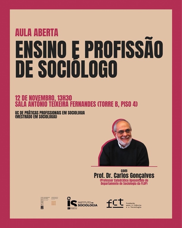 Isabel Rebelo2025-11-06T20:18:58+00:0012 de novembro às 13.30, Sala António Teixeira Fernandes (Torre B, piso 4) Prof. Doutor Carlos Manuel Gonçalves (Professor Catedrático Aposentado do Departamento de Sociologia da FLUP) UC de Práticas Profissionais em Sociologia/Mestrado em Sociologia