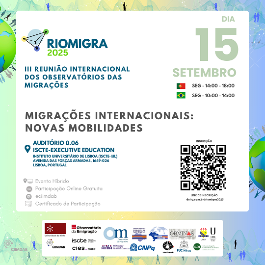 Isabel Rebelo2025-09-02T15:15:59+00:00O Observatório da Emigração organiza, em parceria com o Centro Internacional de Investigação e Pesquisa sobre Migração e Diáspora Acadêmica Brasileira (CIIMDAB) e diversas instituições em Portugal e no Brasil, a III Reunião Internacional dos Observatórios das Migrações (RIOMIGRA), no dia 15 de setembro, das 14h00 às 18h00, em formato híbrido. Com o tema “Migrações [...]