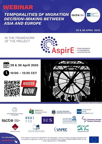 Isabel Rebelo2025-04-23T14:12:27+00:00Join us for Webinar 3 "Temporalities of migration decision-making bewteen Asia and Europe" organised by Iscte - Instituto Universitário de Lisboa with the help of the ULB - Université libre de Bruxelles ! Date: 29 and 30 April 2024 Time: 10h –12h30 CET for both days Online (registration needed!)Dive with us into migrants' aspirations and their im/mobility experiences in both Asia [...]