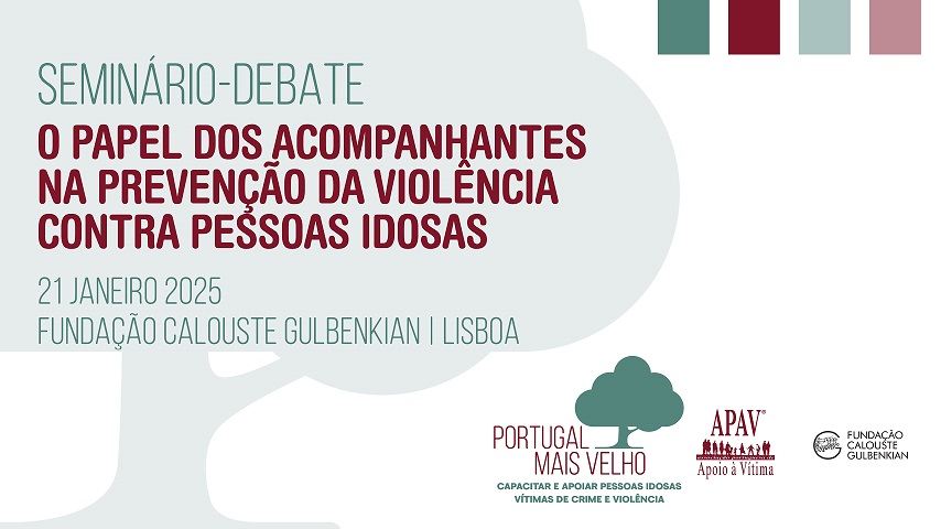 Isabel Rebelo2024-12-27T16:23:53+00:0021 de janeiro, entre as 9h e as 13h, na Sala 1, da Fundação Calouste Gulbenkian. Este Seminário-Debate realizar-se-á no âmbito do projeto Portugal Mais Velho – Capacitar e Apoiar Pessoas Idosas Vítimas de Crime e Violência, a terceira fase da iniciativa Portugal Mais Velho desenvolvida em parceria entre a APAV e a Fundação [...]