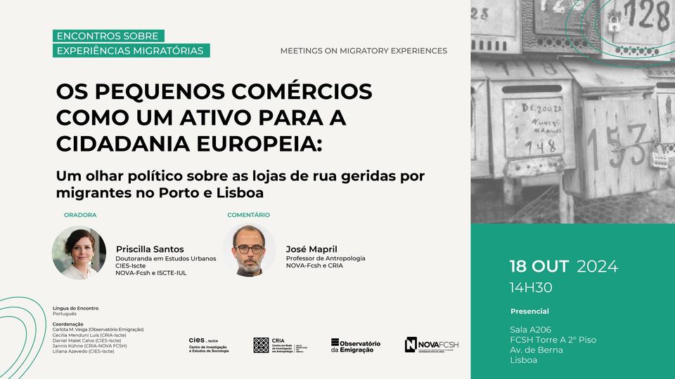 Isabel Rebelo2024-10-16T13:17:30+00:0018 de outubro / FCSH, Lisboa Os pequenos comércios como um ativo para a cidadania europeia: um olhar político sobre as lojas de rua geridas por migrantes no Porto e Lisboa Oradora: Priscilla Santos, Doutoranda em Estudos Urbanos, CIES-Iscte, NOVA-Fcsh e ISCTE-IUL Comentário: José Mapril, Professor em Antropologia, NOVA-Fcsh e CRIA Resumo: Nesta apresentação [...]