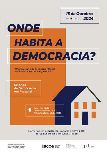 Isabel Rebelo2024-10-09T10:38:28+00:0015 de outubro de 2024 | 10h15-18h30 Iscte, Ala Autónoma, Clube Iscte Sessão comemorativa do 10.º aniversário do Seminário Mensal Movimentos Sociais e Ação Política do Iscte - Instituto Universitário de Lisboa A entrada no evento é livre e este terá um formato híbrido, podendo ser acompanhado presencialmente ou via Zoom. O Seminário Mensal Movimentos Sociais [...]