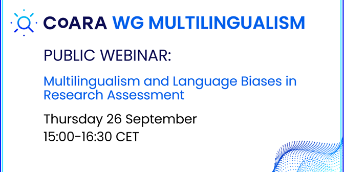 Isabel Rebelo2024-09-18T13:49:26+00:00CoARA WG on Multilingualism will organize a public webinar on Thursday 26 September 2024 from 15:00 to 16:30 CEST on multilingualism and language biases in researcher assessment. Register here. In the webinar, which takes place on the European Day of Languages, the WG action plan, on-going work and opportunities for engagement will be presented, with time for questions [...]