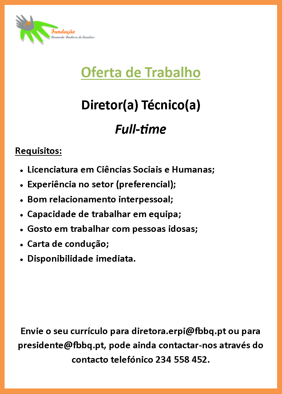 Diretor/a Técnico/a | Fundação Bernardo Barbosa de Quadros Fundação Bernardo Barbosa de Quadros https://www.fbbq.pt/fundacao/recrutamento Quinta do Linheiro 3740- 183 Rocas do Vouga E.mail: geral@fbbq.pt Telefone: 234 558 452 Fax: 234 598 701 website: http://www.fbbq.pt Isabel Rebelo2024-10-30T14:08:59+00:00