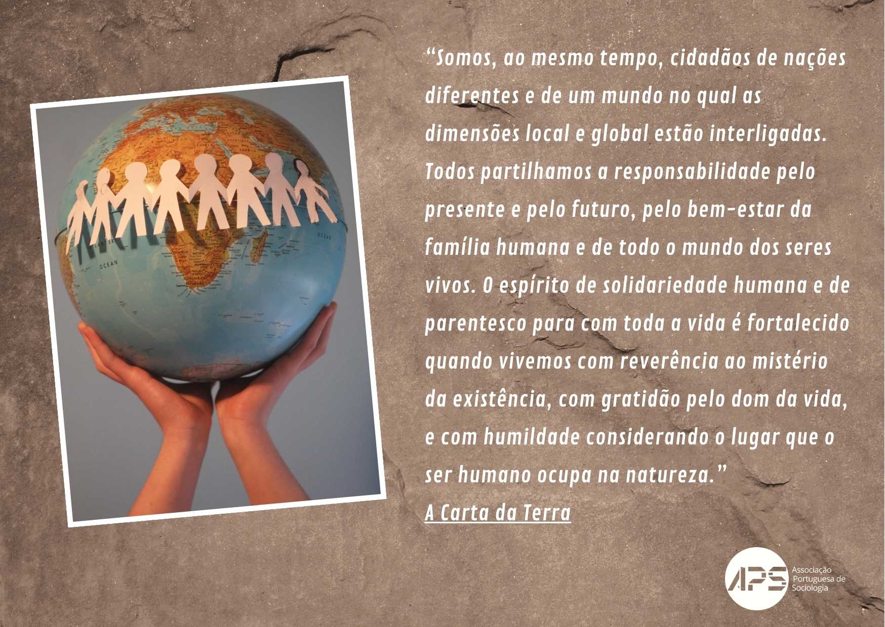 Somos, ao mesmo tempo, cidadãos de nações diferentes e de um mundo no qual as dimensões local e global estão interligadas. Todos partilhamos a responsabilidade pelo presente e pelo futuro, pelo bem-estar da família humana e de todo o mundo dos seres vivos. O espírito de solidariedade humana e de parentesco para com toda a vida é fortalecido quando vivemos com reverência ao mistério da existência, com gratidão pelo dom da vida, e com humildade considerando o lugar que o ser humano ocupa na natureza.” A Carta da Terra [postal]