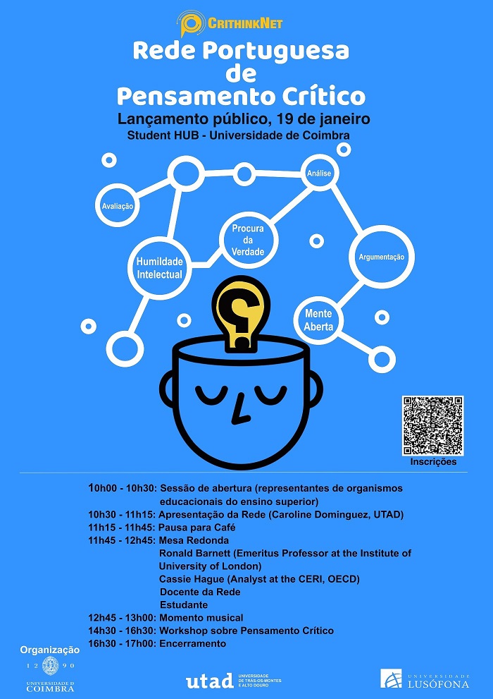 A Universidade de Coimbra (UC) acolhe no dia 19 (sexta-feira) o lançamento público da Rede Portuguesa de Pensamento Crítico (Crithinknet), uma iniciativa que reúne mais de uma centena de docentes de 45 instituições de ensino superior nacionais públicas e privadas, com o objetivo de promover o pensamento crítico no ensino superior. A cerimónia de apresentação decorre a partir das 10h00, no Student Hub (edifício da Faculdade de Medicina, Pólo I da UC).
