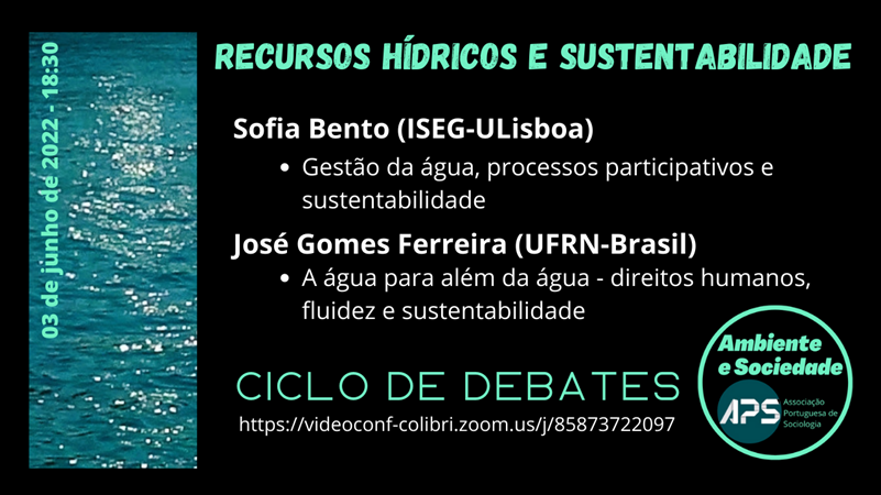 Para abordar estas questões, contamos, como de costume, com dois oradores convidados: Sofia Bento, professora associada e investigadora no ISEG-Ulisboa com uma reflexão sobre “a gestão da água, os processos participativos e a Sustentabilidade” e José Gomes Ferreira, professor do Programa de Pós-Graduação em Estudos Urbanos e Regionais da Universidade Federal do Rio Grande do Norte (Brasil), com uma reflexão sob o título “A água para além da água: direitos humanos, fluidez e sustentabilidade”.